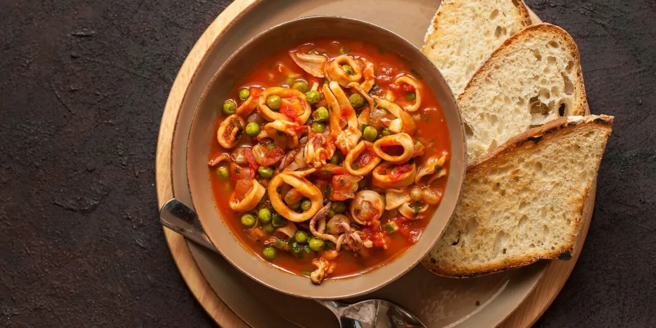 10 мин. Количество порций 4 Ингредиенты Тушки кальмаров 700 г Оливковое масло 1 ст. ложка Лук-шалот 1 штука Чеснок 2 зубчика Петрушка свежая ½ пучка Сухое белое вино 60 мл Свежий или замороженный зелёный горошек 150 г Томатный соус 150 г Соль по вкусу Перец чёрный молотый по вкусу