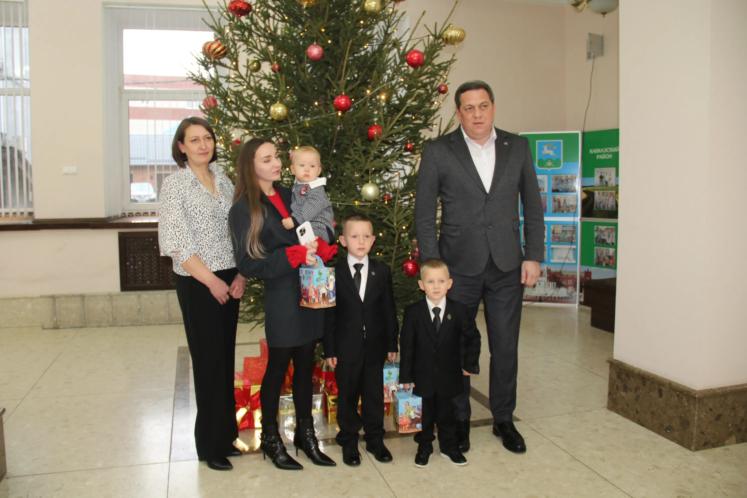 Мальчики получили от Юрия Ханина сладкие новогодние подарки, а Макар с удовольствием принял приглашение посидеть в кресле главы района.