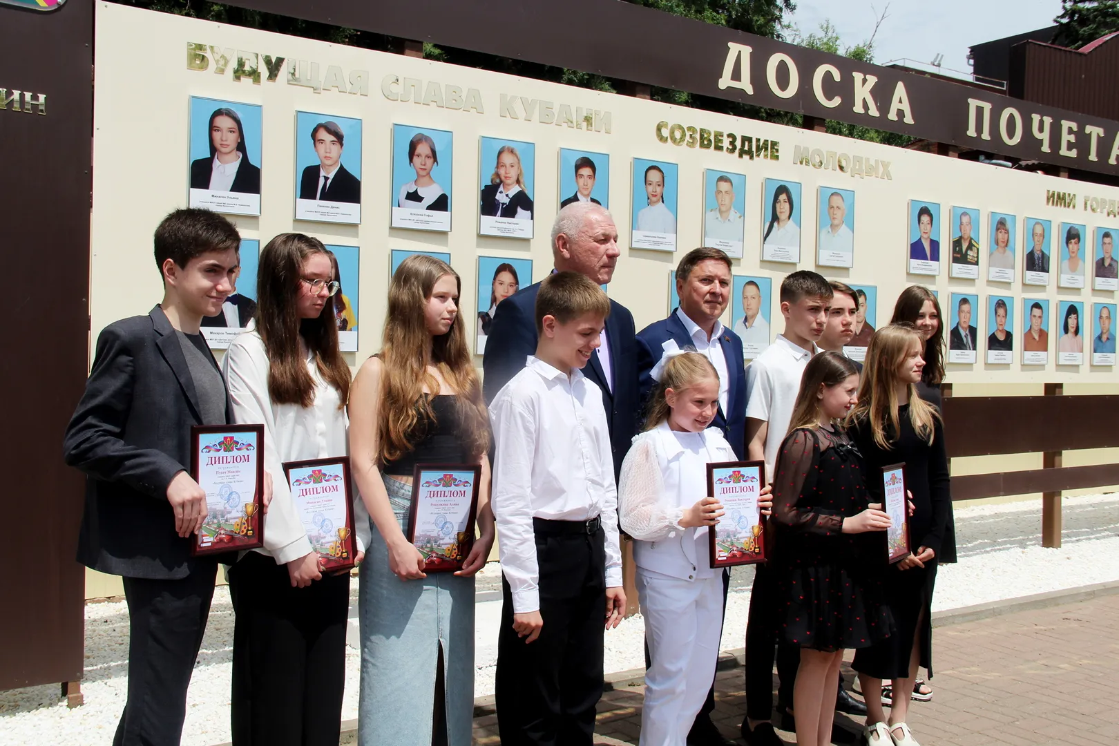 Владимир Елисеев и Сергей Михайлюк выразили слова благодарности родителям и наставникам за развитие таланта в детях, а ребятам вручили дипломы и памятные подарки. По традиции сделали общее фото на память у городской Доски почета, на которой уже красуются фотографии замечательных детей Кропоткина.