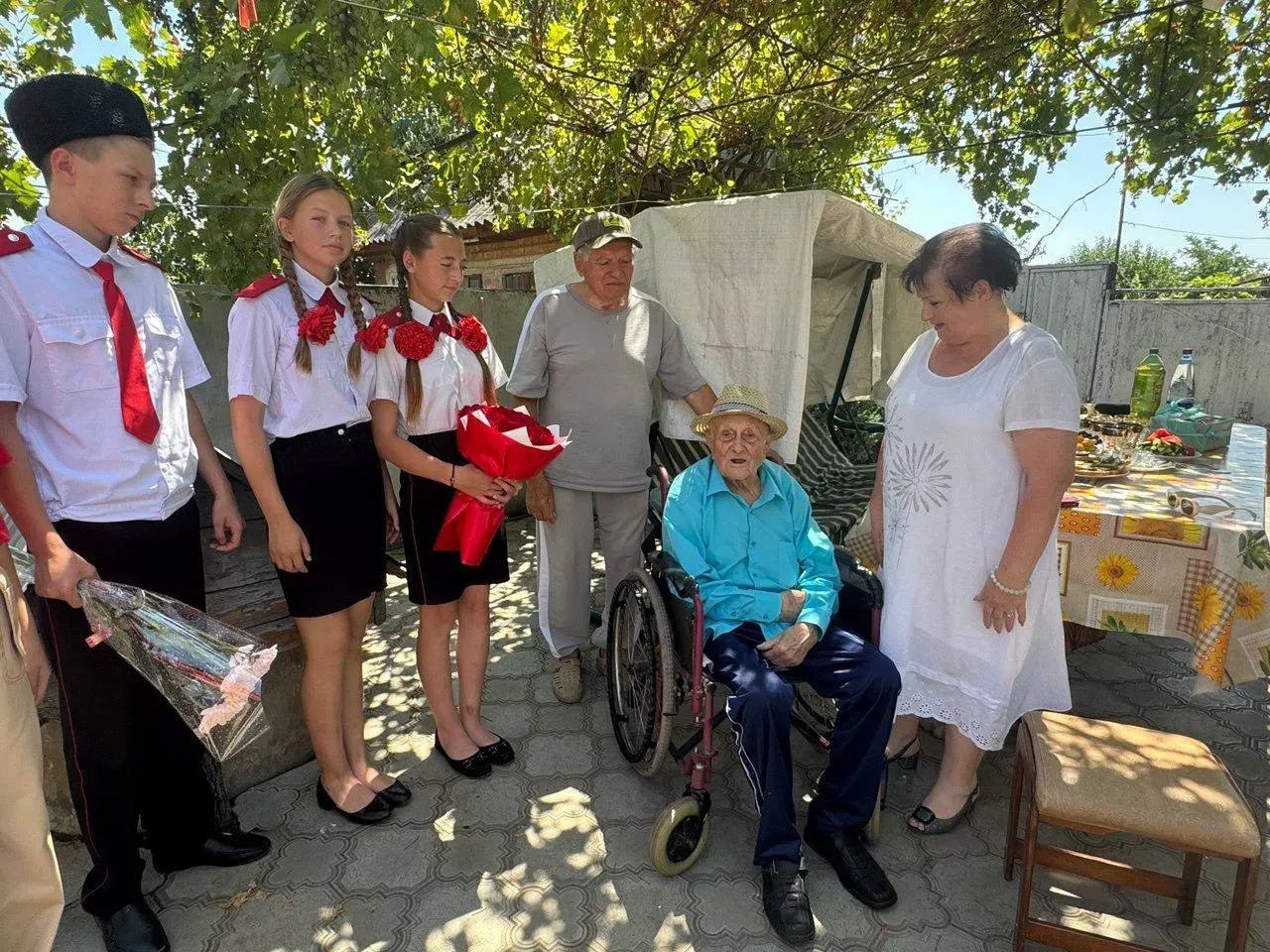 Посередине уютного зеленого двора станичного дома накрыт стол. В окружении родных и близких Иван Николаевич ждет гостей к своему вековому юбилею. На праздник приехал глава Кавказского района Юрий Ханин. Он передал поздравительные письма от президента Российской Федерации и губернатора Краснодарского края.