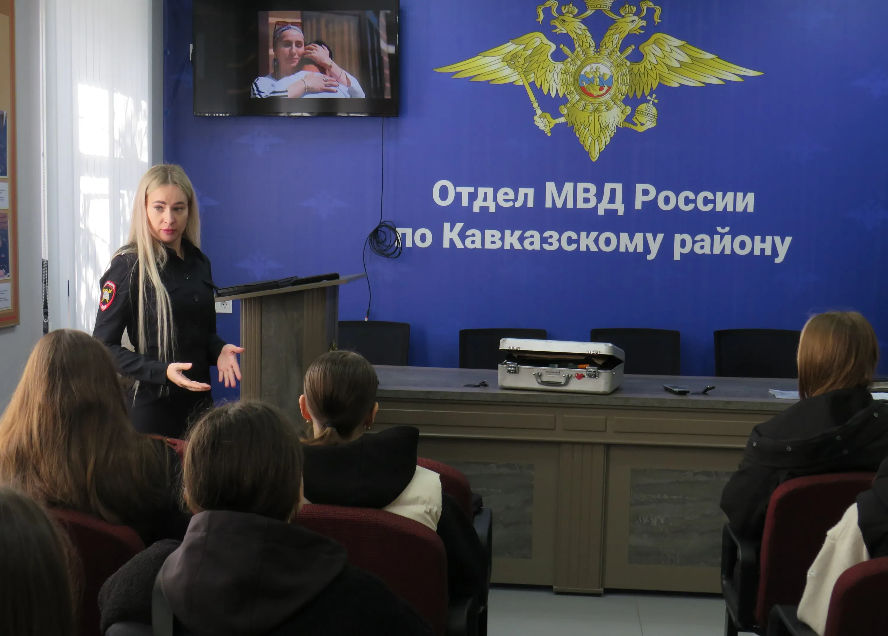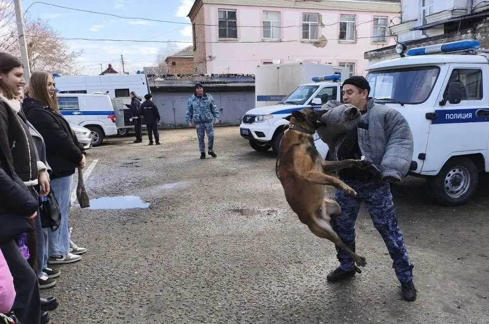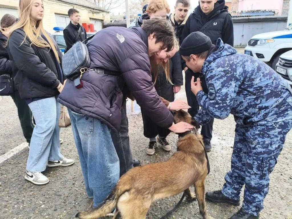 Знакомство учащихся Северо-Кавказского колледжа многопрофильного образования со службой в полиции началось с самого зрелищного момента. Инспектор-кинолог младший лейтенант полиции Игорь Усенко сначала рассказал первокурсникам и второкурсникам, обучающимся по специальности «юриспруденция», об особенностях воспитания служебных собак, после чего экскурсанты познакомились с одним из его четверолапых напарников по кличке Лютер - породы «бельгийская овчарка». Облачившись в защитный костюм, толщина которого не позволяет животному причинить травму человеку, кинолог продемонстрировал работу по пресечению побега из-под конвоя. Служебный пес, обученный розыску человека по запаховым следам, молнией пронесся по площадке, налетел на «преступника» и, вцепившись в рукав, за долю секунды повалил его на землю, не издавая ни звука.