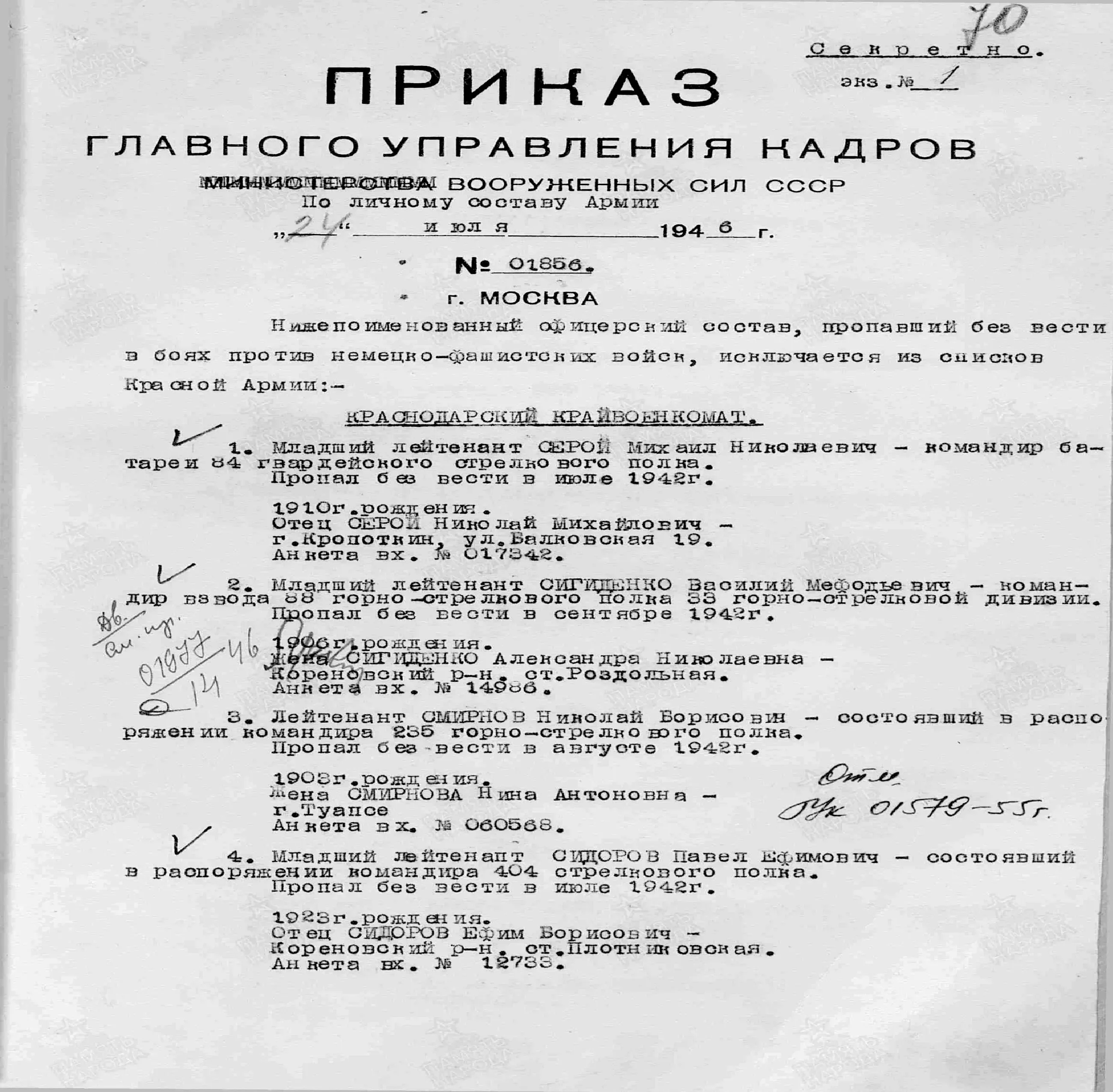 Из архивного приказа Главного управления кадров Министерства Вооруженных Сил СССР по личному составу армии от 24 июля 1946 года следует, что исключенный из списков Красной армии без вести пропавший Серóй Михаил Николаевич, был зарегистрирован по месту проживания в г.Кропоткине по улице Балковская,19 (ныне — переулок Спортивный,17 «А»). Жена — Серóй Вера Захаровна (г.Ростов-на-Дону, Пролетарский район I, улица Советская,14/2).