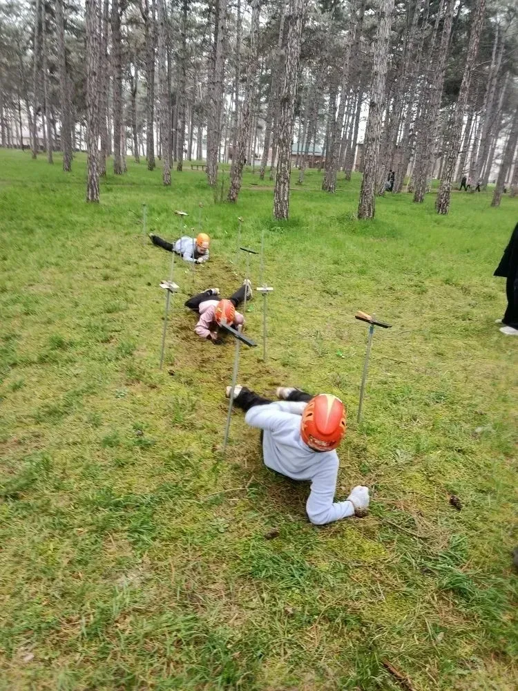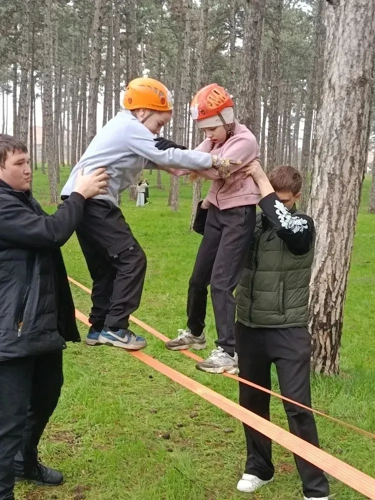 Под руководством учителей мальчишки и девчонки в смешанных командах дружно преодолевали параллельные перила, болото, узкий лаз, «паутину» и маятник. Самые яркие эмоции вызвал «Донбасский мост», вот уж где коленки дрожали у многих. Судейская команда состояла из старших воспитанников и выпускников отделения спортивного туризма Центра внешкольной работы Кропоткина.