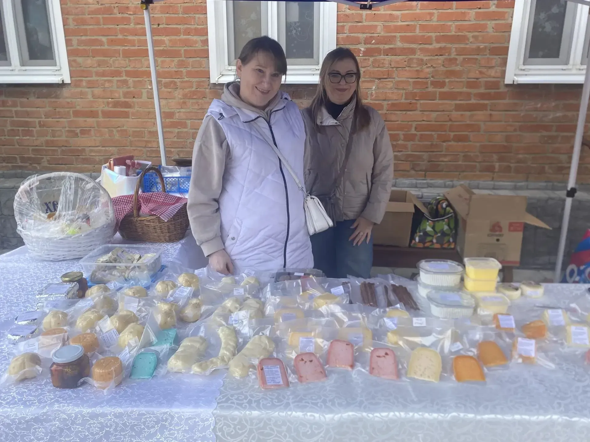 На ярмарочном столе разместили свою сырную продукцию хозяюшки. Руководитель производства Елена Рикер рассказывает, что их сыры, твердые и мягкие, изготовлены из молока домашних коров, которое приобретают в храме станицы Кавказской. На прилавке сыры, которые в магазине не купишь — они с различными добавками.