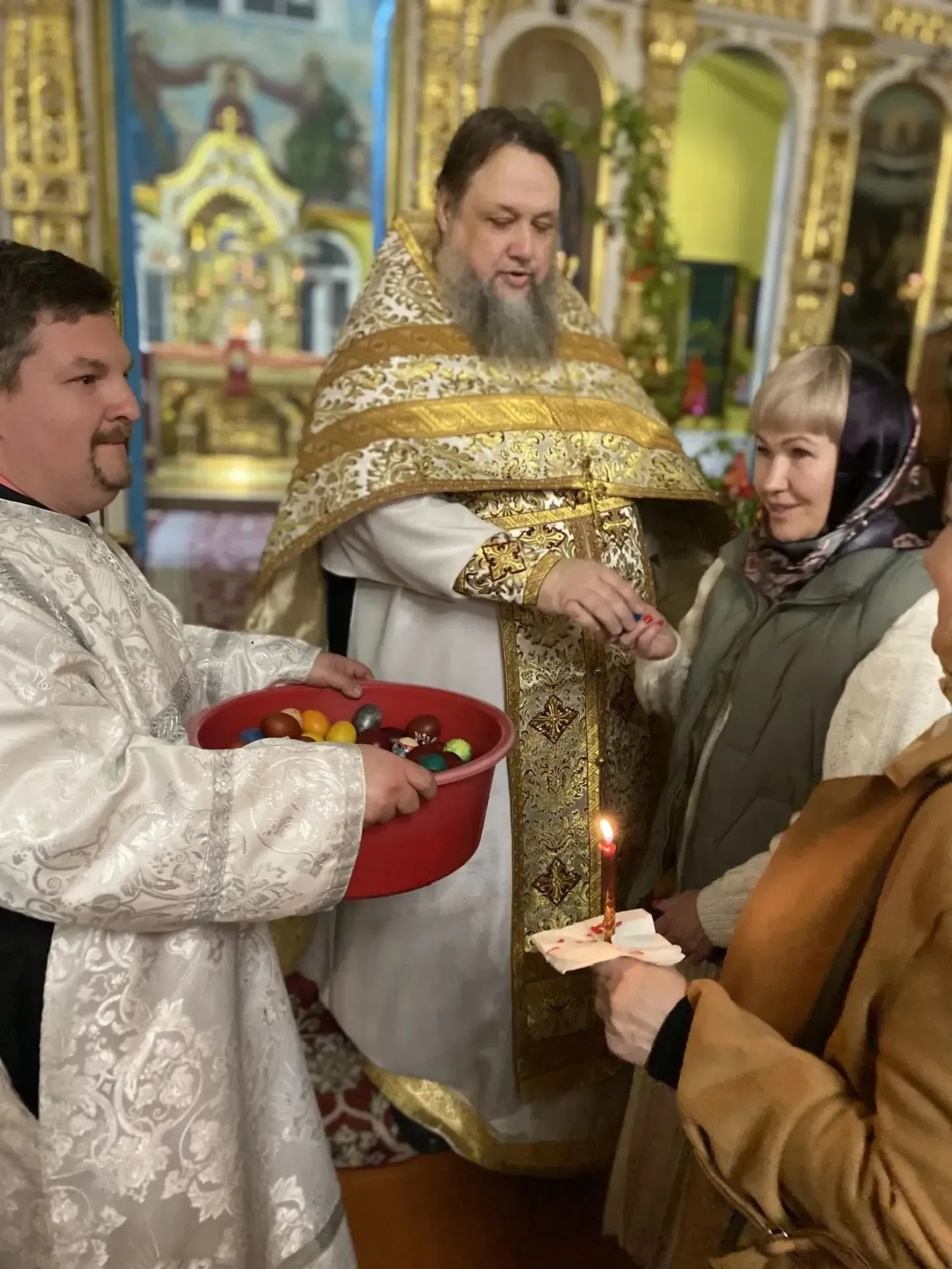 Когда завершается торжественная литургия, настоятель выходит к нам с крашеными яйцами, которые в огромной корзине держат его помощники. Это такая добрая традиция. Отец Андрей раздает их каждому, кто присутствует на литургии, как бы делясь радостью Воскресения и благословляя нас на весь год.